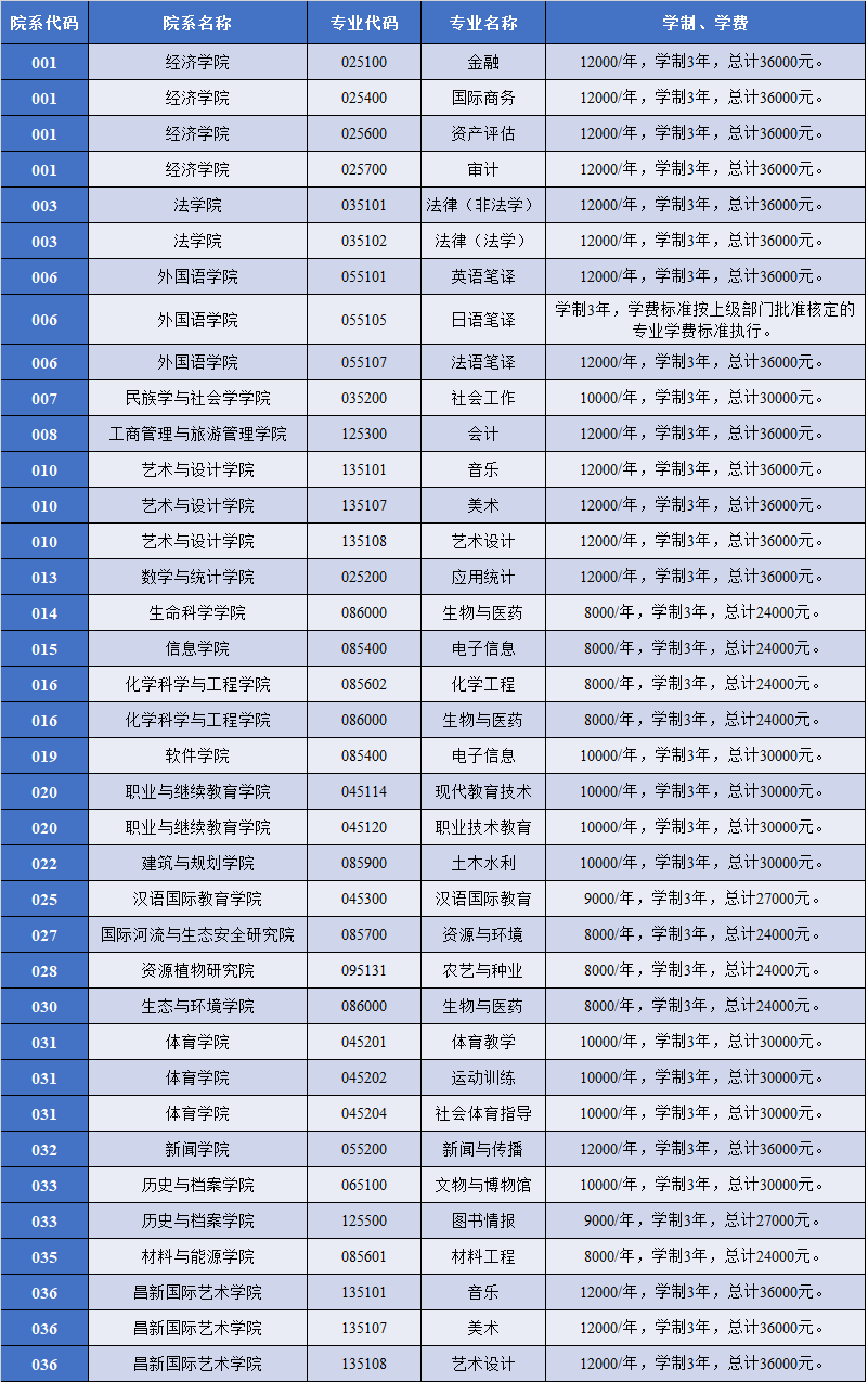 2. 全日制专业学位学费标准见下表:
