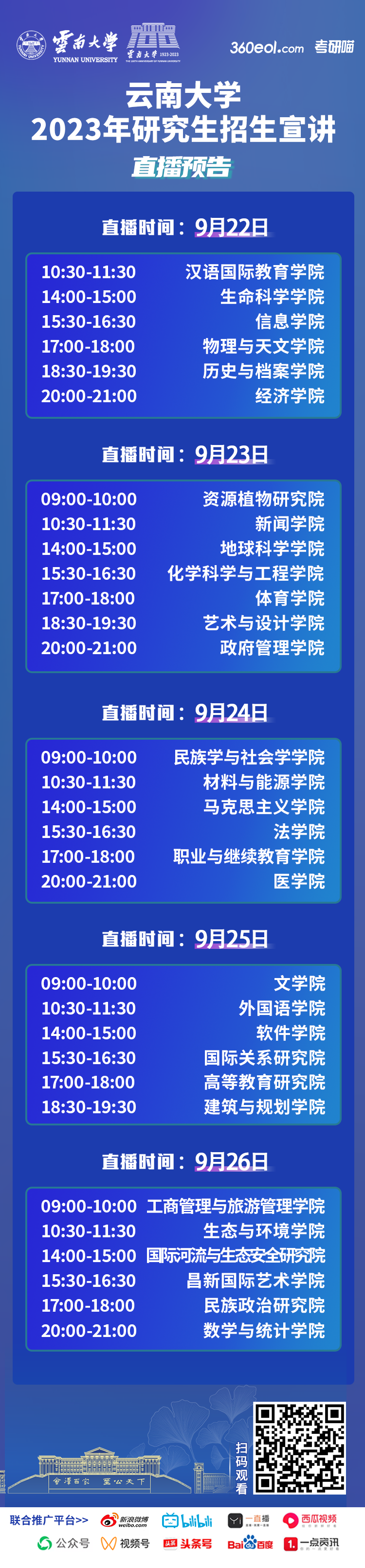 为增进广大学子对云南大学的了解,建立多方位的沟通渠道,我校将于2022年9月22日至26日开展2023年硕士研究生招生网络直播咨询会。届时云南大学各学院的老师们将通过直播与同学们“零距离”交流,介绍学院特色,解答招生咨询。欢迎关注,敬请期待!(考生可扫描图片底部二维码进入直播间观看)
