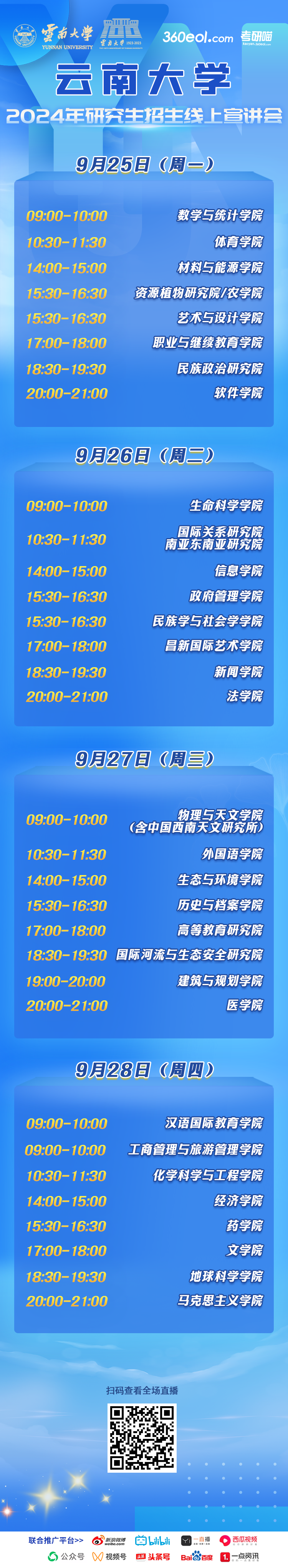 为增进广大学子对云南大学的了解,建立多方位的沟通渠道,我校将于2023年9月25日至28日开展2024年硕士研究生招生网络直播咨询会。届时云南大学各学院的老师们将通过直播与同学们“零距离”交流,介绍学院特色,解答招生咨询。欢迎关注,敬请期待!(考生可扫描图片底部二维码进入直播间观看)