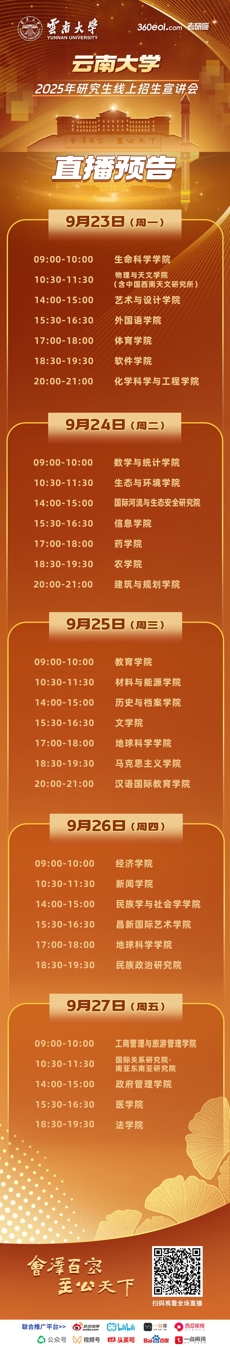 为增进广大学子对云南大学的了解,建立多方位的沟通渠道,我校将于2024年9月23日至27日开展2025年硕士研究生招生网络直播咨询会。届时云南大学各学院的老师们将通过直播与同学们“零距离”交流,介绍学院特色,解答招生咨询。欢迎关注,敬请期待!(考生可扫描图片底部二维码进入直播间观看)