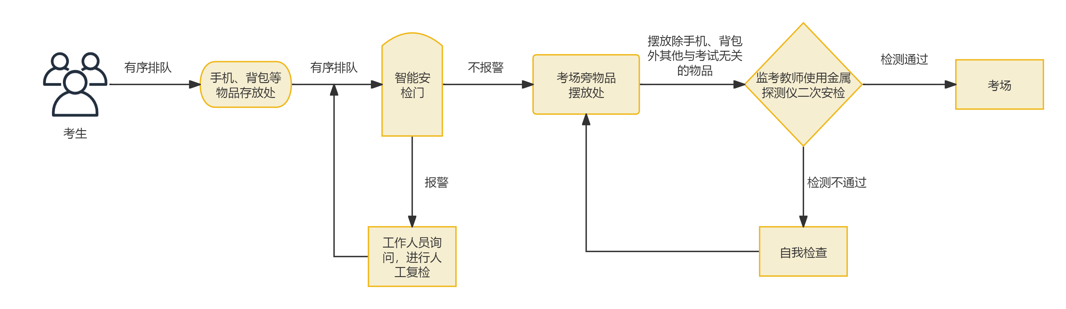 我考点将实行“智能安检门+人工安检”的双重安检机制。考生须在各考区指定的物品存放处提前存放手机等考试违禁物品以及与考试无关的包和物品,随后有序通过“智能安检门”,进入考试封闭管理区域。在正式进入考场前,还将接受人工安检,所有与考试无关的物品不得带入考场。