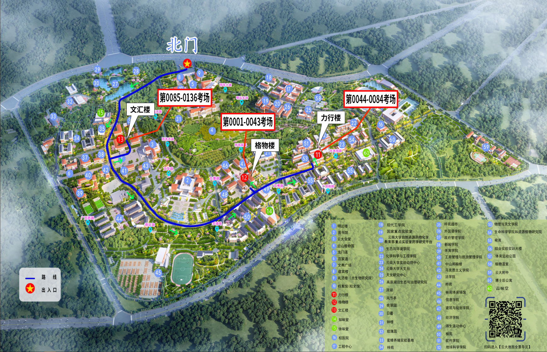 1.本考点考场分布在云南大学呈贡校区(昆明市呈贡区大学城东外环南路)格物楼、力行楼、文汇楼3个教学区域共6栋教学楼,具体安排为:格物楼1栋(考场号:0001-0025)、格物楼2栋(0026-0043)、力行楼2栋(考场号:0044-0059)、力行楼4栋(考场号:0060-0084)、文汇楼2栋(考场号:0085-0112)、文汇楼1栋(考场号:0113-0136)。