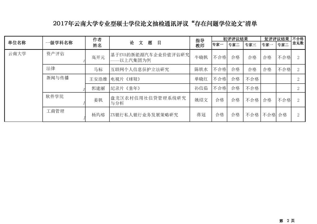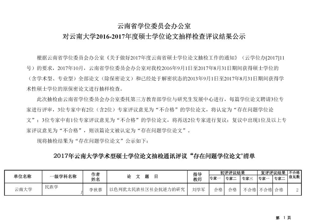 云南省学位委员会办公室对云南大学2016-2017年度硕士学位论文抽样检查评议结果公示