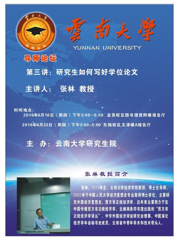 由云南大学研究生院主办的导师论坛邀请学校各个专业领域的知名学者为广大研究生授课,通过为全校研究生提供一个多视角、宽视域、高层次学术交流平台,开阔学生学术视野、激发学术热情、活跃学术思想、提高创新能力,达到提升研究生培养质量的目的。