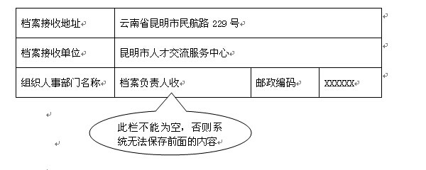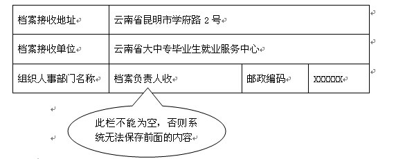 2、已有明确的档案接受单位的,请详细填写就业单位地址、单位名称及单位内档案接收部门名称(格式如:昆明市翠湖北路2号 云南大学 人事处);