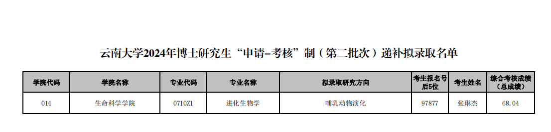 我校2024年博士研究生“申请-考核”制(第二批次)拟录取考生中,微生物学专业拟录取考生谢俊杰因个人原因主动放弃拟录取资格。根据《云南大学2024年博士研究生招生考核及录取工作实施办法》及有关文件规定,从学科建设和人才培养的角度出发,经生命科学学院导师考核团队、招生工作领导小组集体研究讨论并报研究生院备案,现将该计划调整至进化生物学专业“哺乳动物演化”方向,递补拟录取该方向下综合考核成绩最高的考生张琳杰。相关信息公示如下: